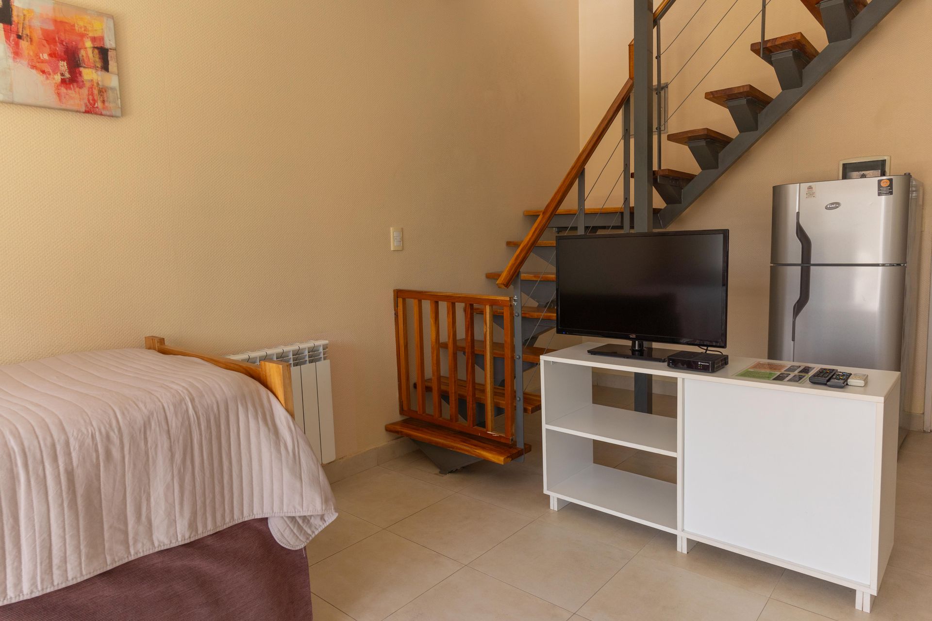 - Living-dining room with a comfortable single bed with box spring and an additional rollaway bed
